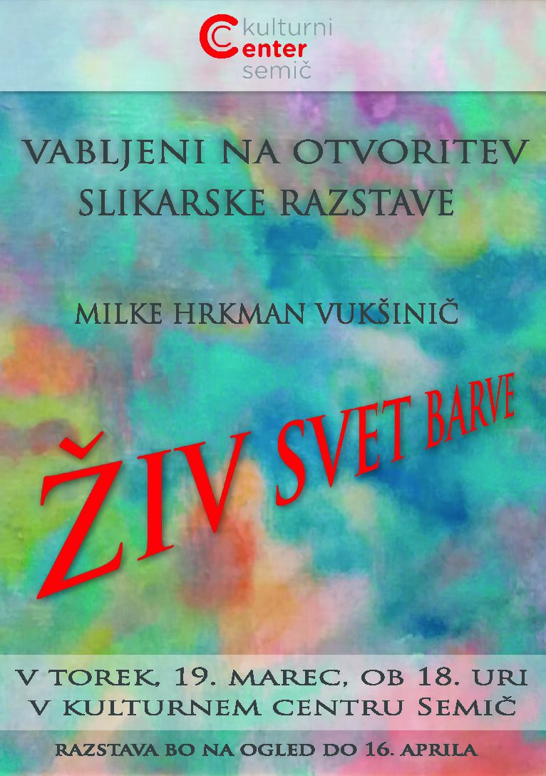 Kulturni center Semič vas vabi na otvoritev slikarske razstave Milke Hrkman Vukšinič “ŽIVI SVET BARVE” v torek, 19. marca, ob 18. uri v KC Semič.